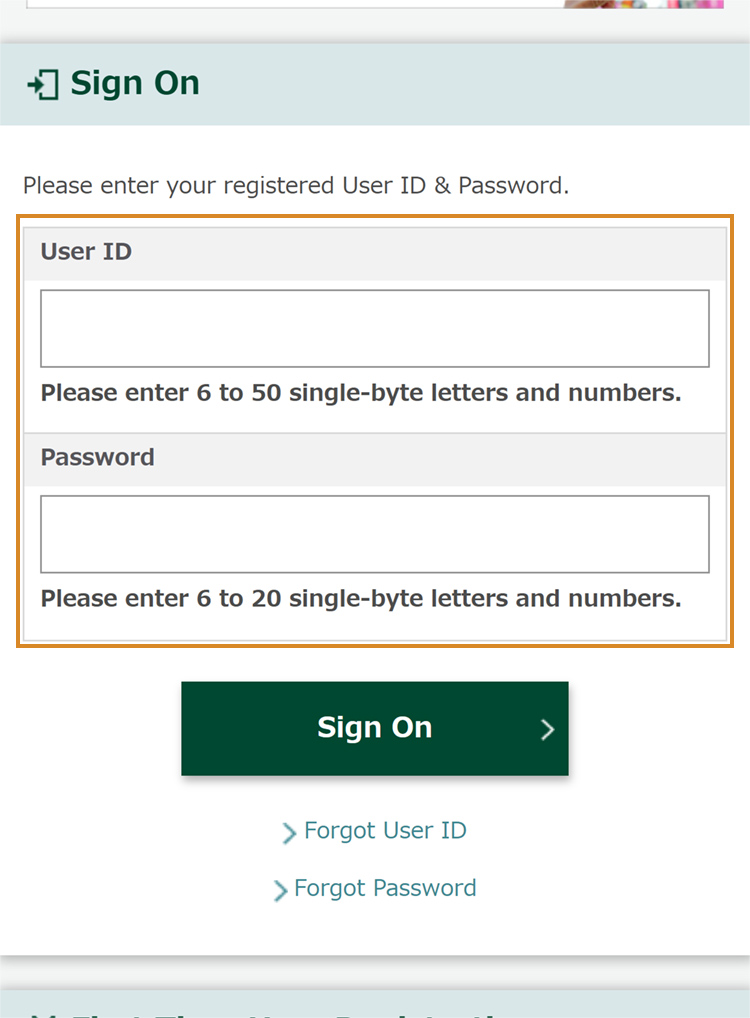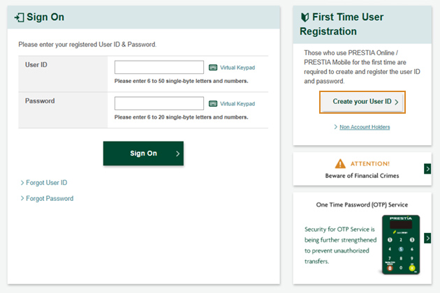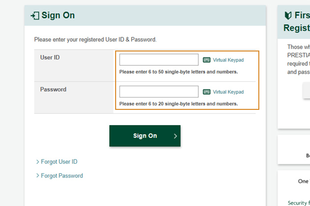 Please enter your registered User ID and Password and press the "Sign On" button to use PRESTIA Online/Mobile.