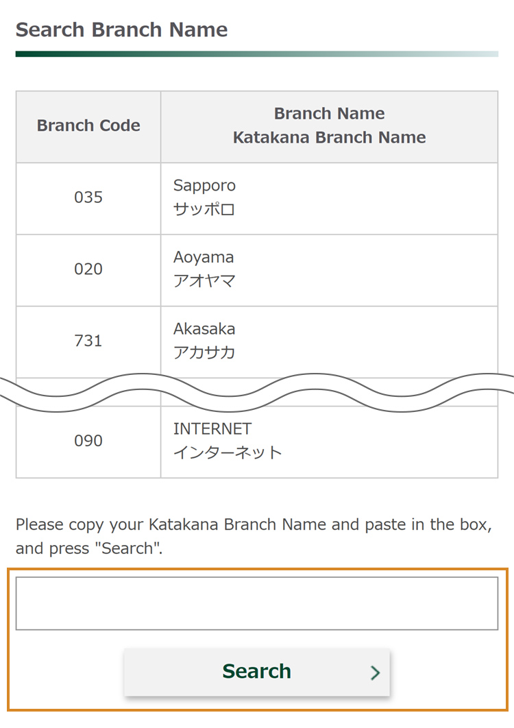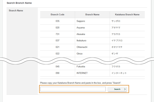 Input your Katakana Branch Name and press "Search" (You can also copy your Katakana Branch Name from Branch Name list and paste in the box).