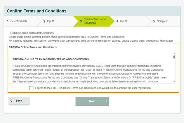 After confirming and agreeing to the Terms and Conditions, proceed to the next screen. You can also review the Terms and Conditions on this page.